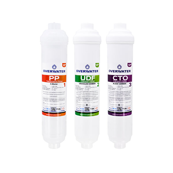 OverWater Kapalı Kasa Su Arıtma Cihazı 3 Lü Inline Filtresi Seti Aşamalı ( Membransız Set ) Filtre ve Özellikleri 1. Aşama: PPS INLINE 5 MİKRON SEDİMENT FİLTRE ( NSF ONAYLI ) Giriş suyunda bulunan çamur, kir ve pasın alınmasını sağlayarak membran filtrenin ömrünü uzatmayı hedefler. 2. Aşama: GAC INLINE FİLTRE ( NSF ONAYLI ) Giriş suyunda bulunan klorun ve organik maddelerin alınmasını sağlayarak membran filtrenin ömrünü uzatmayı hedefler. 3. Aşama: CTO INLINE FİLTRE ( NSF ONAYLI ) Giriş suyunda bulunan ve ilk 2 filtreden kaçan tortu, klor ve organik maddelerin alınmasını sağlayarak membran filtrenin ömrünü uzatmayı hedefler. Paket İçeriği 12' Inline 5 Mikron Sediment Filtre (NSF Onaylı) * 1 Adet 12' Inline GAG (UDF) Aktif Karbon Filtre (NSF Onaylı) * 1 Adet 12' Inline Blok (CTO) Aktif Karbon Filtre (NSF Onaylı) * 1 Adet Not: Filtre el değmeden otomatik makinelerle üretilmektedir. GENEL KURULUM / İŞLETİM / BAKIM GEREKLİLİKLERİ Filtrenin akış yönüne dikkat edin. Filtre gövdesi üstünde bulunan Flow yazısı ve ok yönü çıkışı gösterir. Hnd Filtrenin çubuk kısımlarının üzerinde çizik olup olmadığın kontrol edin, çizik yoksa fittingsi çubuğa doğru, iki kademe olacak şekilde, sonuna kadar itin. Yeni kartuşu kullanmadan önce 5 galon su ile yıkayın ve sızıntı olup olmadığını kontrol edin. Sızıntı meydana gelirse, fittings ve hortumu kontrol edin. Nominal kapasiteye ulaşıldığında veya akış çok yavaşladığında kartuşu değiştirin. Kartuşu su giriş şartlarına göre maximum 12 ayda değiştirin. Not: Yeterli dezenfeksiyon yapılmamış, mikrobiyolojik olarak güvenli olmayan ve kalitesi bilinmeyen sularda kullanmaktan kaçının. Ürün montajı müşteriye aittir. Firmamızın teknik servisinden telefonda destek alabilirsiniz. GTIN / EAN : 8684952846002