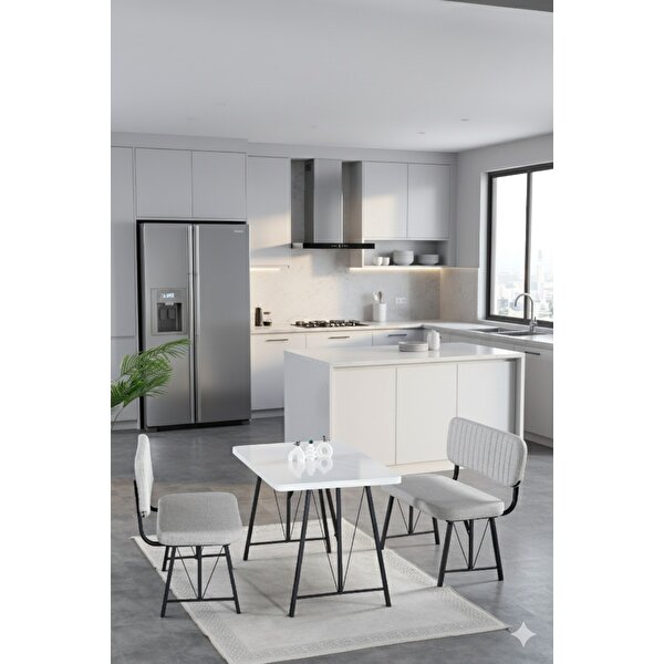 Parlazonhome Elfin 70x110cm Sabit Beyaz, Yemek Masası, Yemek Masası Takımı, 2 Gri Benchli