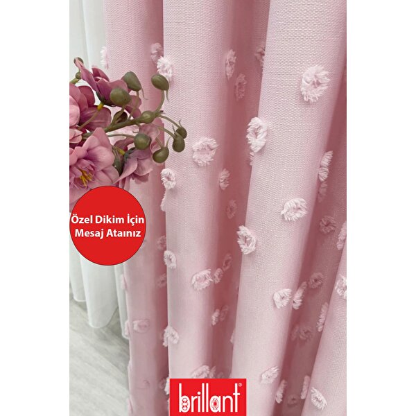 Perde Pendik Fon Perde Şeker Pembe Pufy Brillant Püsküllü, Ponponlu, Saçaklı Fon Perde Sık Pileli Keten Pano Fon 100x280 cm