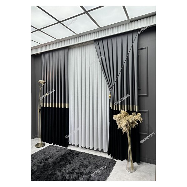 Perde Pendik Pano Fon Perde,elegans Seri Azra Desen Siyah Gold Gri 90x255 cm