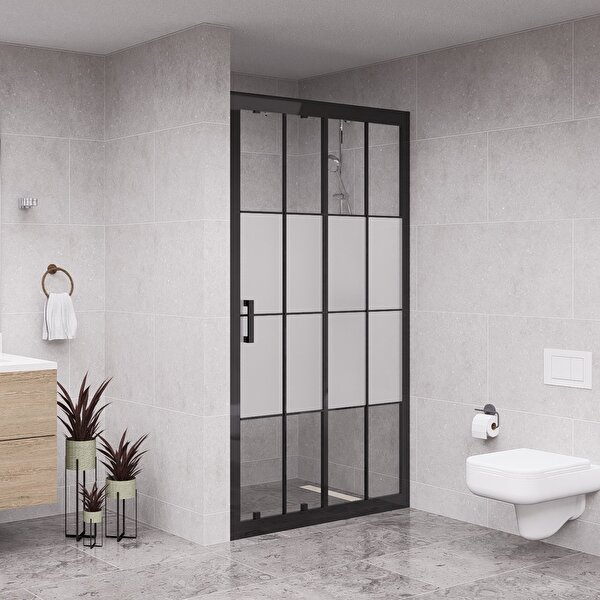 Raumark Black Nexa 6mm Karolajlı Yarım Kumlamalı Cam 1 Sabit 1 Sürgü İki Duvar Arası Duşakabin 138 cm