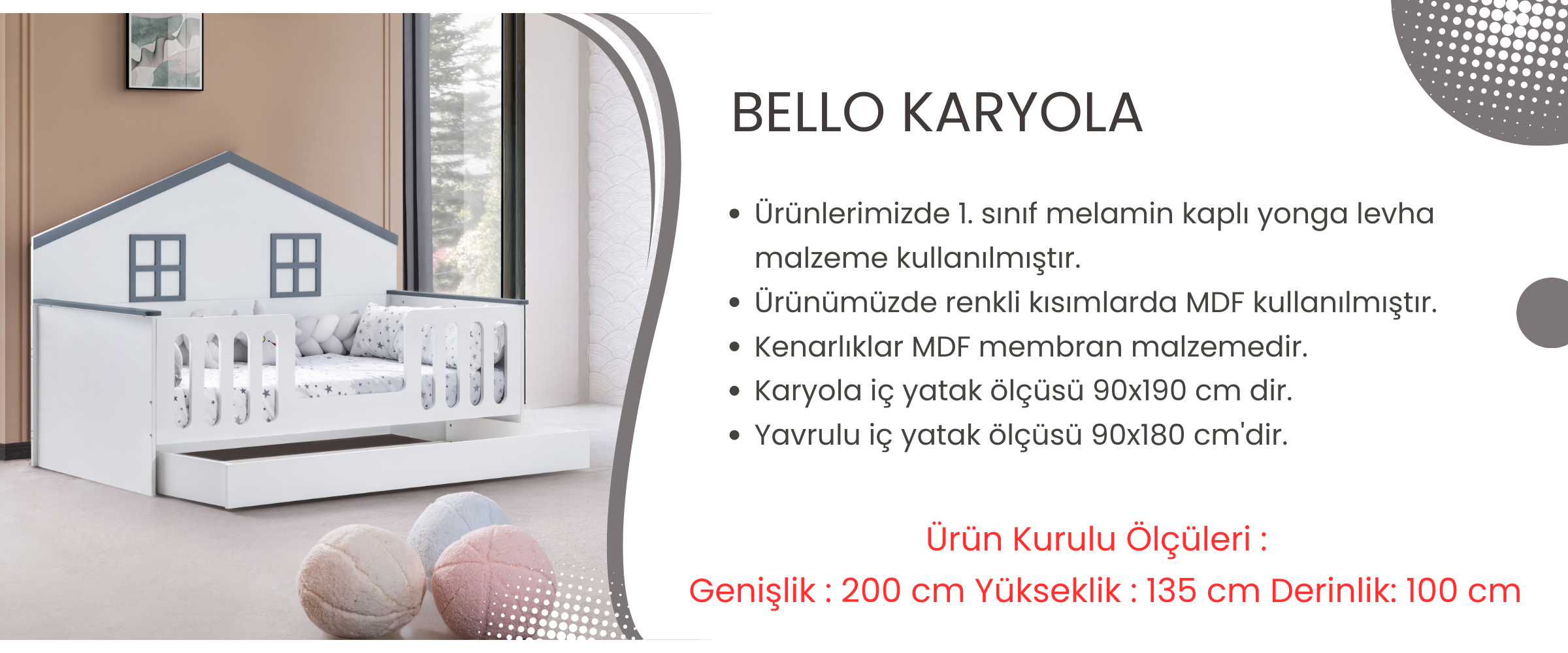 Yavrulu iç yatak ölçüsü 90x180 cm'dir.