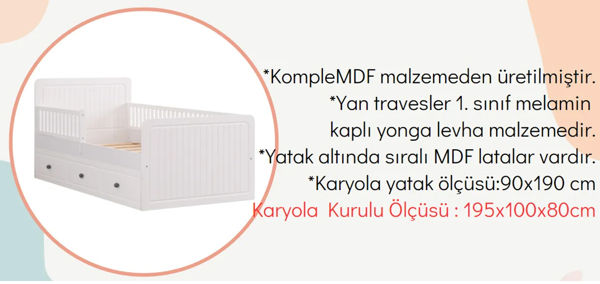 Yavru Karyola yatak ölçüsü: 90x180x15 cm'dir.