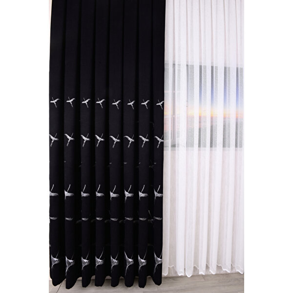 Setekshome Anka Kuşu Nakışlı Siyah Fon Perde Tek Kanat 1x3 Sık Pile 140x250 cm