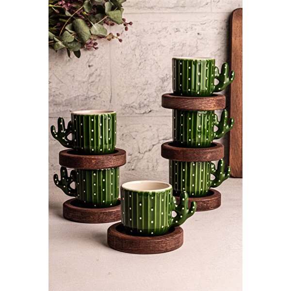 Snippy Kaktüs - El Yapımı Seramik Ahşap Tabaklı Türk Kahvesi Espresso Fincan Seti 12 Parça 6 Kişilik