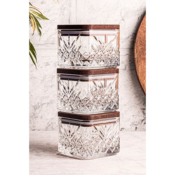 Snippy Milla Kare 3'lü Ahşap Vakumlu Kare Kapaklı Cam Kahvaltılık Çok Amaçlı Cam Çerezlik 230 Ml