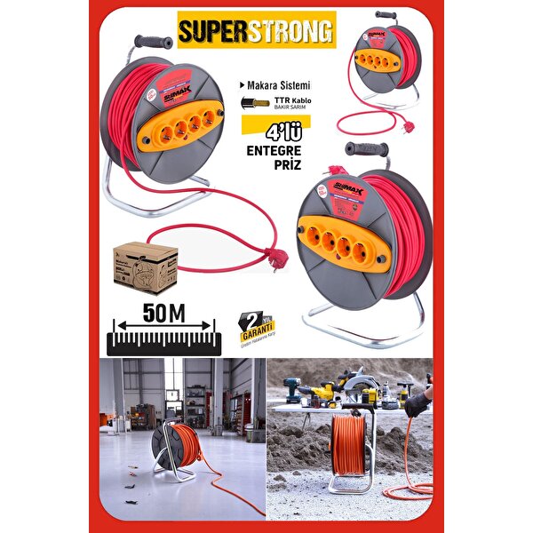 STILMAX Metal Ayaklı Makaralı Uzatma Kablosu 3x2.5 Mm 50 Metre 4 Prizli Seyyar Uzatma Kablosu Atölye Ev Tip