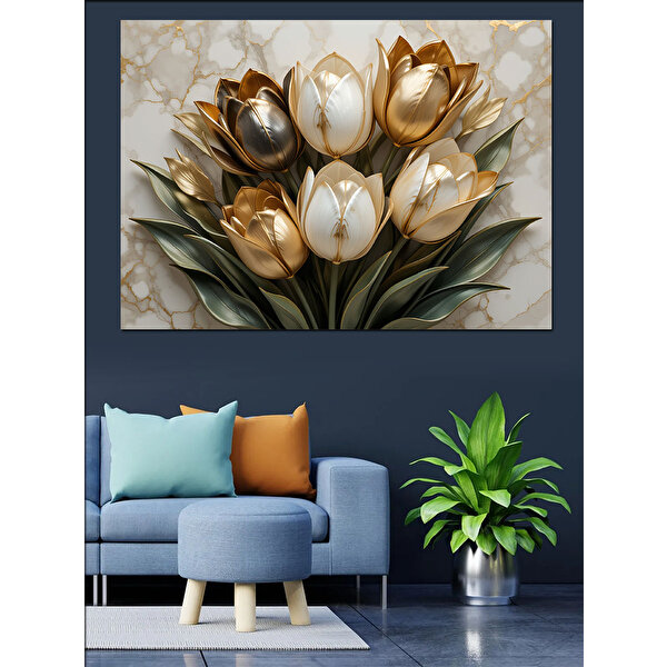 Tablomega Altın Beyaz Lale Aranjmanı Dekoratif Kanvas - Mdf Ahşap Tablo 70x100 cm