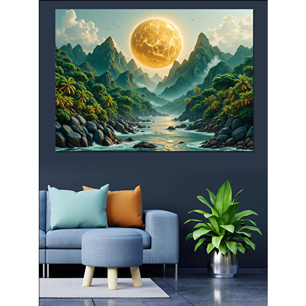 Altın Güneşli Dağ Manzarası Dekoratif Kanvas - Mdf Ahşap Tablo