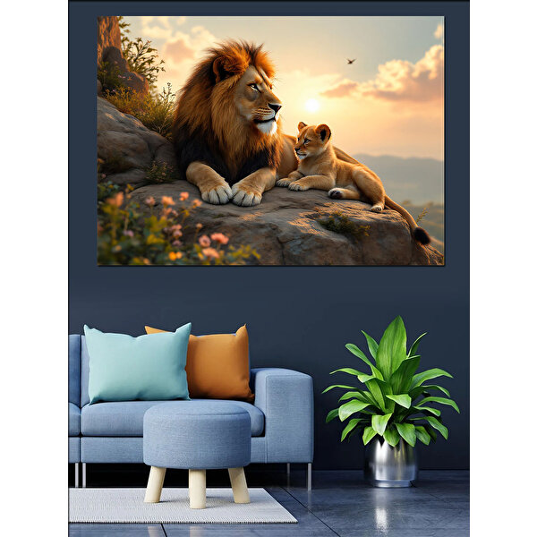 Aslan Ve Yavrusu Gölgede Dekoratif Kanvas - Mdf Ahşap Tablo