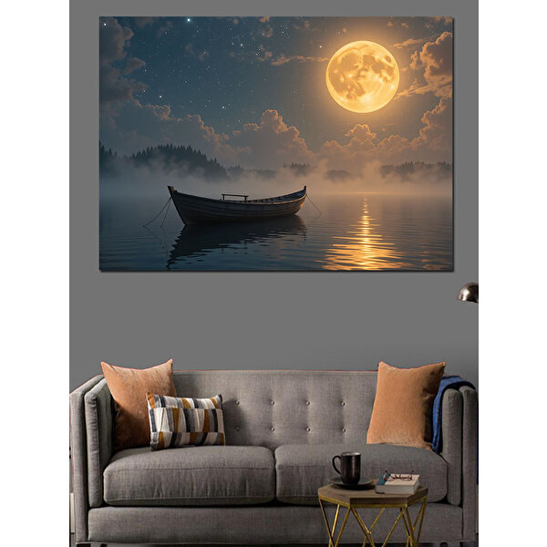 Ay Işığında Kayık Dekoratif Kanvas - Mdf Ahşap Tablo