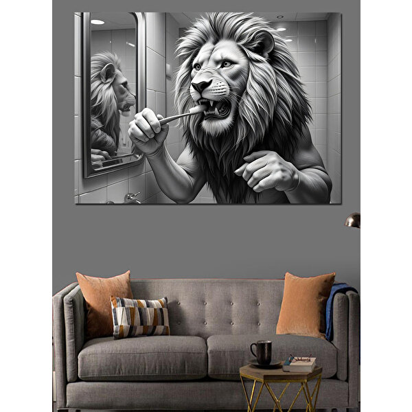 Diş Fırçalayan Aslan Dekoratif Kanvas - Mdf Ahşap Tablo