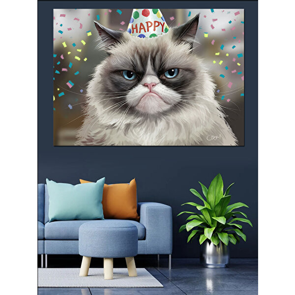 Doğum Günü Şapkalı Kedi Dekoratif Kanvas - Mdf Ahşap Tablo