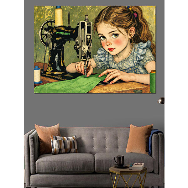 Tablomega Eski Dikiş Makinesi Ve Kız Dekoratif Kanvas - Mdf Ahşap Tablo 50x70 cm