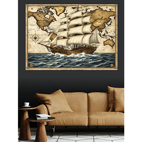 Tablomega Eski Dünya Haritası Ve Gemi Dekoratif Kanvas - Mdf Ahşap Tablo 100x140 cm