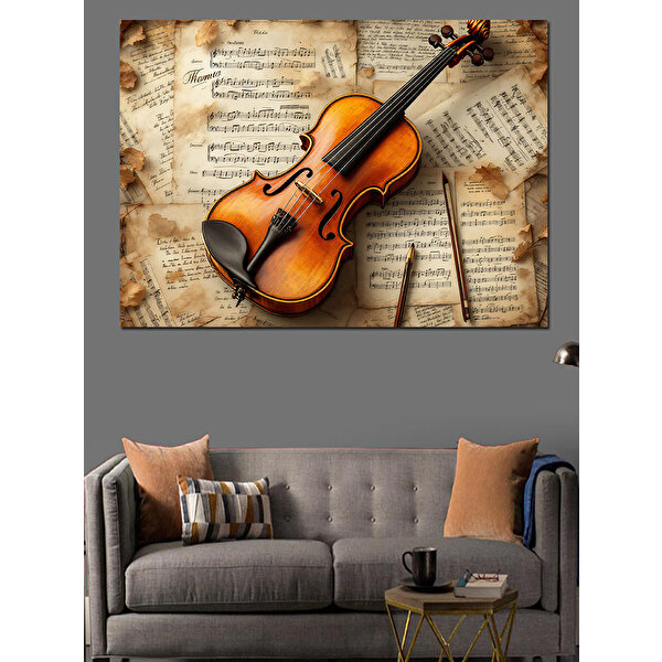 Eski Keman Ve Nota Dekoratif Kanvas - Mdf Ahşap Tablo