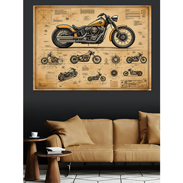 Tablomega Eski Motosiklet Teknik Çizimi Dekoratif Kanvas - Mdf Ahşap Tablo 35x50 cm
