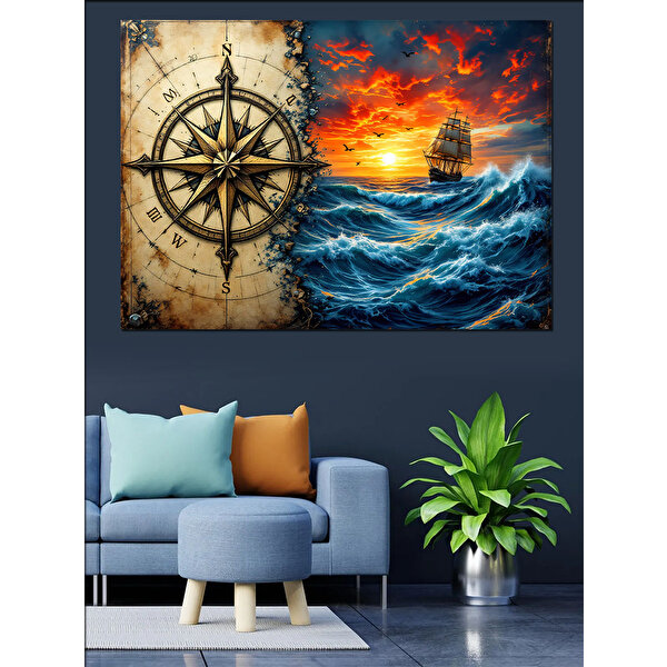 Tablomega Eski Pusula Ve Harita Dekoratif Kanvas - Mdf Ahşap Tablo 35x50 cm