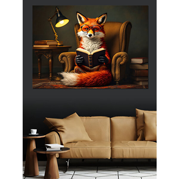 Gözlüklü Kitap Okuyan Tilki Dekoratif Kanvas - Mdf Ahşap Tablo
