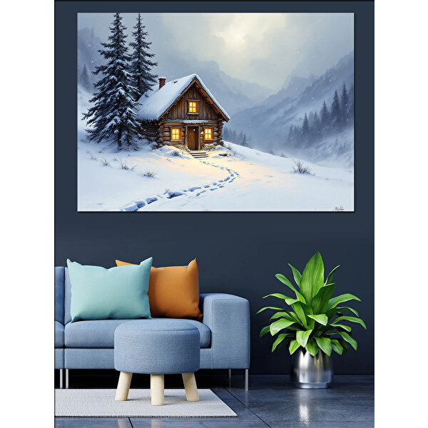 Tablomega Karlı Ormanda Ahşap Kulübe Dekoratif Kanvas - Mdf Ahşap Tablo 25x35 cm