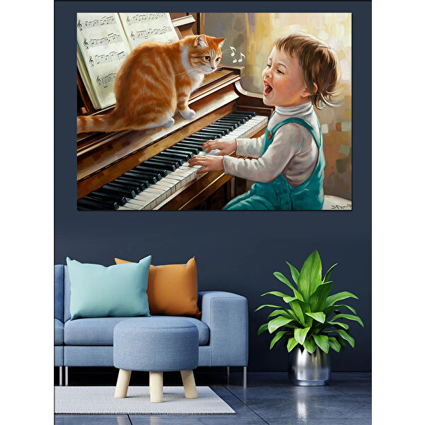 Tablomega Kediyle Piyano Çalan Çocuk Dekoratif Kanvas - Mdf Ahşap Tablo 100x140 cm