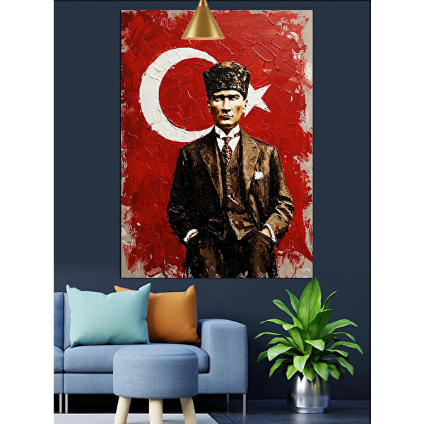 Tablomega Kırmızı Bayraklı Mustafa Kemal Atatürk Tablosu Dekoratif Kanvas - Mdf Ahşap Tablo 70x100 cm