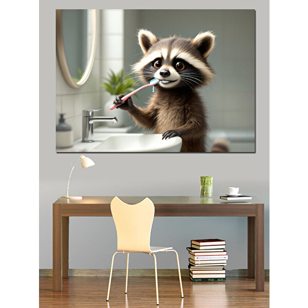 Tablomega Lavaboda Diş Fırçalayan Rakun Dekoratif Kanvas - Mdf Ahşap Tablo 100x140 cm
