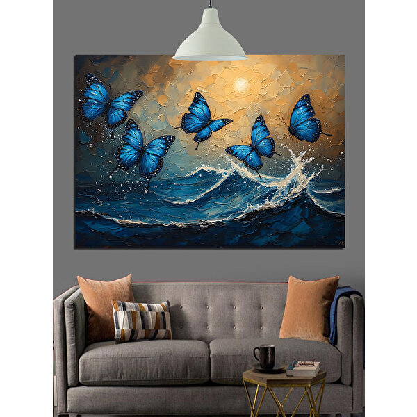 Mavi Kelebekler Deniz Dalgası Dekoratif Kanvas - Mdf Ahşap Tablo
