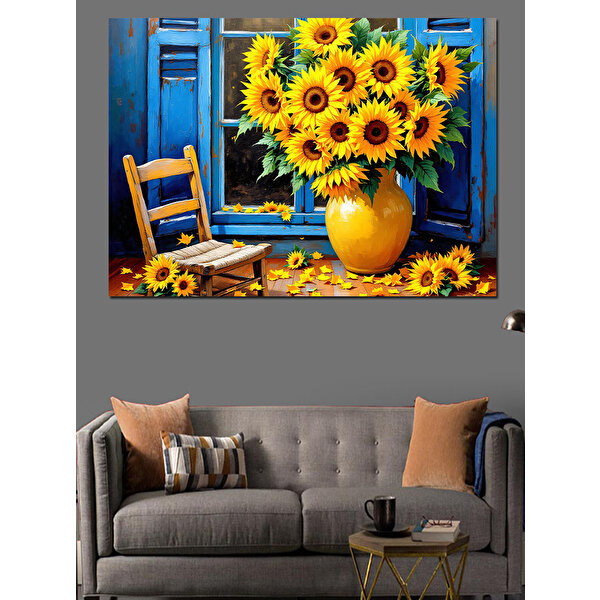 Tablomega Mavi Pencere Ve Güneş Çiçekleri Dekoratif Kanvas - Mdf Ahşap Tablo 70x100 cm