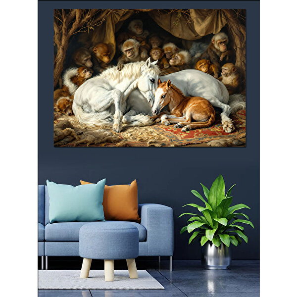 Maymunlarla Uyuyan Atlar Dekoratif Kanvas - Mdf Ahşap Tablo