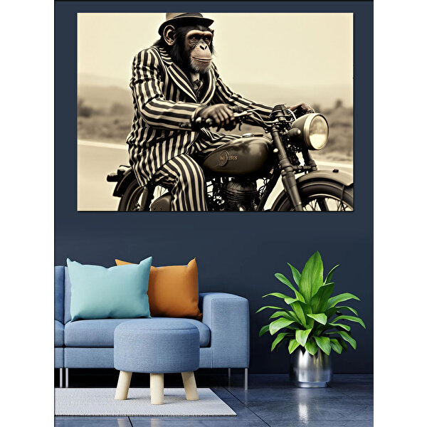 Tablomega Motorsikletli Şık Maymun Dekoratif Kanvas - Mdf Ahşap Tablo 100x140 cm