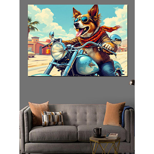 Motosiklet Süren Havalı Köpek Dekoratif Kanvas - Mdf Ahşap Tablo