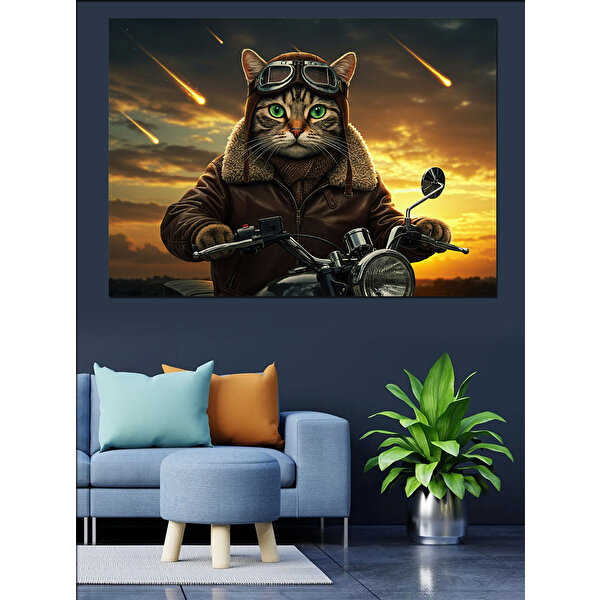 Tablomega Motosikletli Gözlüklü Kedi Dekoratif Kanvas - Mdf Ahşap Tablo 50x70 cm