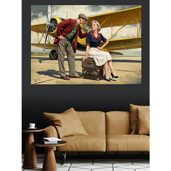 Nostaljik Uçak Yanı Sohbet Dekoratif Kanvas - Mdf Ahşap Tablo