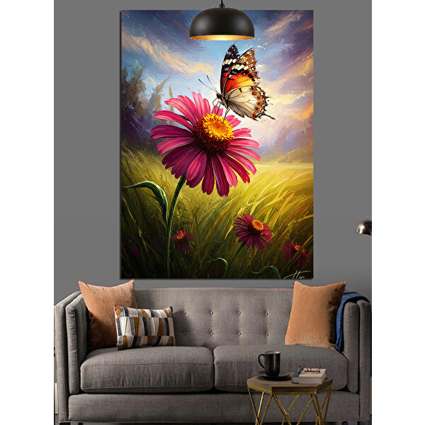 Tablomega Papatya Üstü Kelebek Dekoratif Kanvas - Mdf Ahşap Tablo 50x70 cm