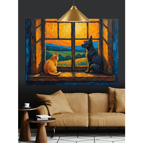 Pencereden Bakan Kedi Ve Köpek Dekoratif Kanvas - Mdf Ahşap Tablo