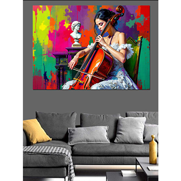 Tablomega Renk Sıçramalı Viyolonsel Kadın Dekoratif Kanvas - Mdf Ahşap Tablo 35x50 cm