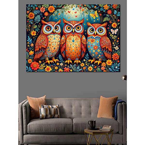 Tablomega Renkli Baykuş Ailesi Dekoratif Kanvas - Mdf Ahşap Tablo 70x100 cm