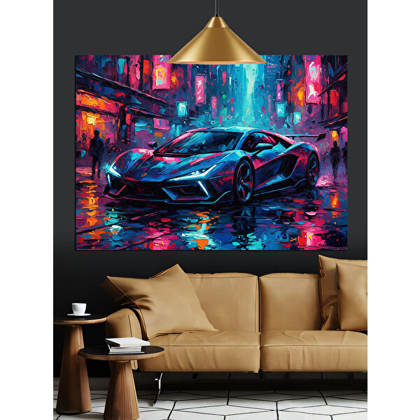 Renkli Işıkta Spor Araba Dekoratif Kanvas - Mdf Ahşap Tablo