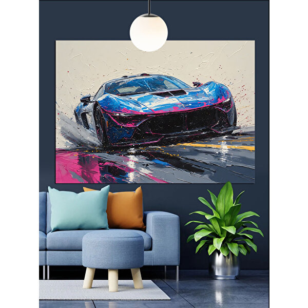 Tablomega Renkli Işıkta Yarış Arabası Dekoratif Kanvas - Mdf Ahşap Tablo 50x70 cm