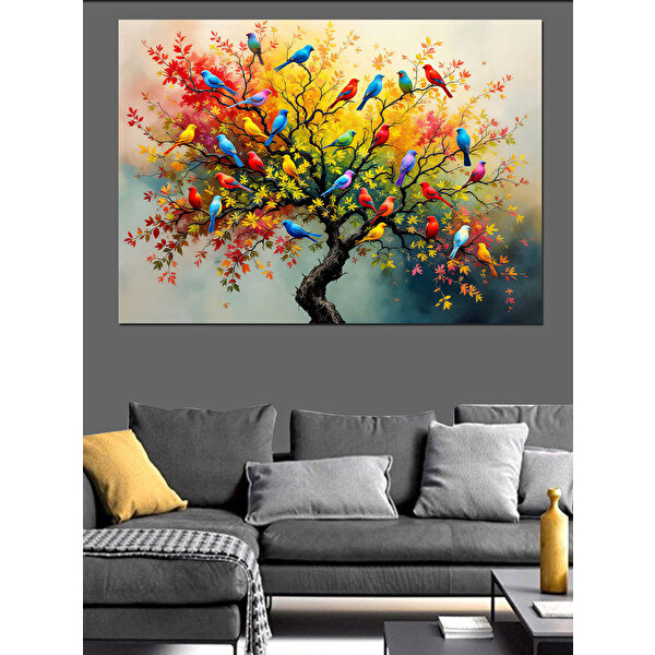 Tablomega Renkli Kuşlu Çiçekli Ağaç Dekoratif Kanvas - Mdf Ahşap Tablo 70x100 cm