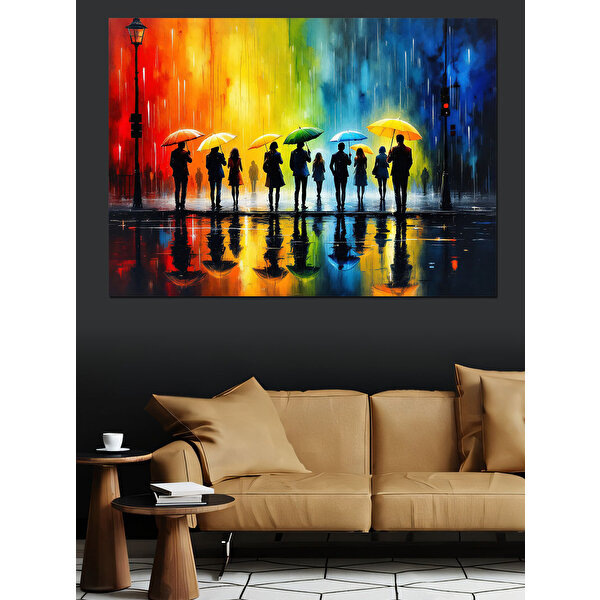 Renkli Yağmurlu Siluet Kalabalık Dekoratif Kanvas - Mdf Ahşap Tablo