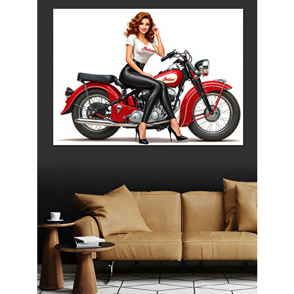 Retro Motosikletli Kadın Dekoratif Kanvas - Mdf Ahşap Tablo