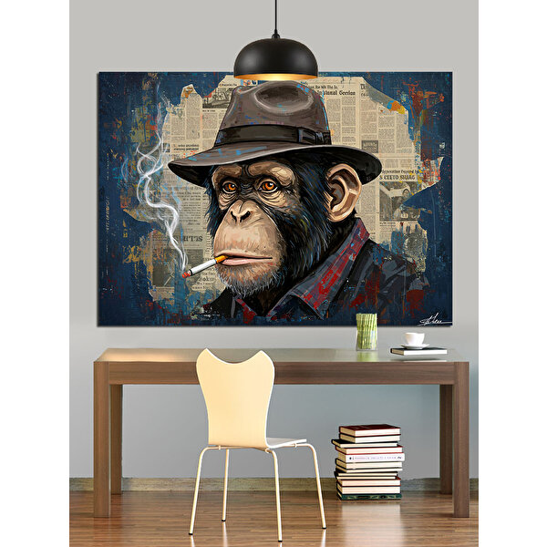 Tablomega Şapkalı Sigara İçen Maymun Dekoratif Kanvas - Mdf Ahşap Tablo 70x100 cm