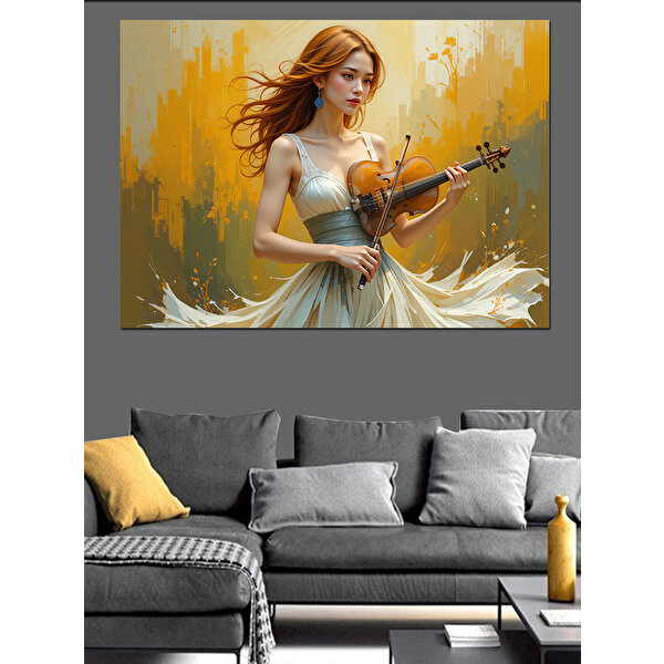 Tablomega Sarı Arka Plan Keman Kadın Dekoratif Kanvas - Mdf Ahşap Tablo 100x140 cm