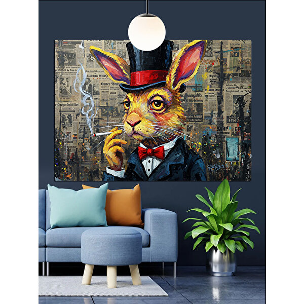 Tablomega Silindir Şapkalı Tavşan Portresi Dekoratif Kanvas - Mdf Ahşap Tablo 35x50 cm