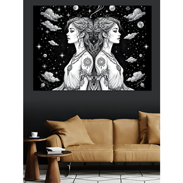 Siyah Beyaz İkizler Burcu Dekoratif Kanvas - Mdf Ahşap Tablo