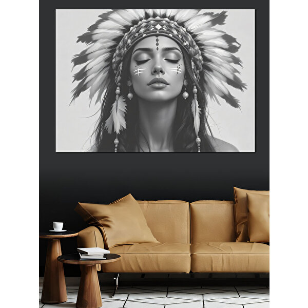 Siyah Beyaz Kızılderili Kadın Dekoratif Kanvas - Mdf Ahşap Tablo