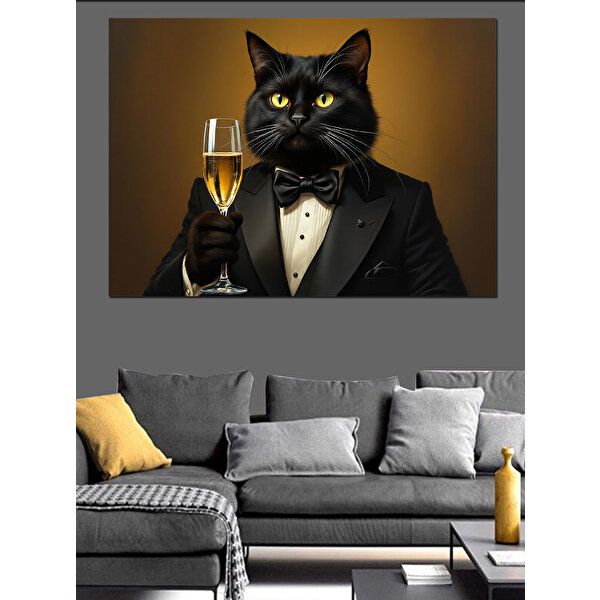 Tablomega Smokinli Kadehli Siyah Kedi Dekoratif Kanvas - Mdf Ahşap Tablo 70x100 cm