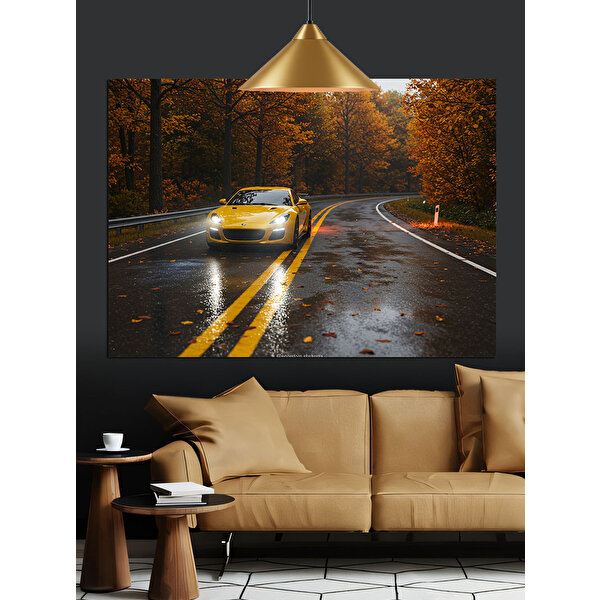 Sonbahar Yolu Ve Sarı Araba Dekoratif Kanvas - Mdf Ahşap Tablo